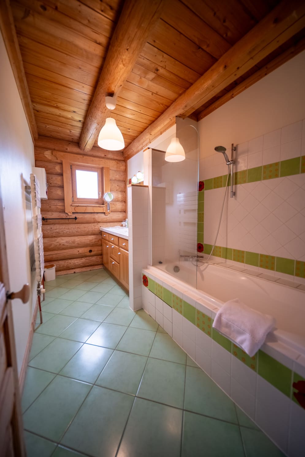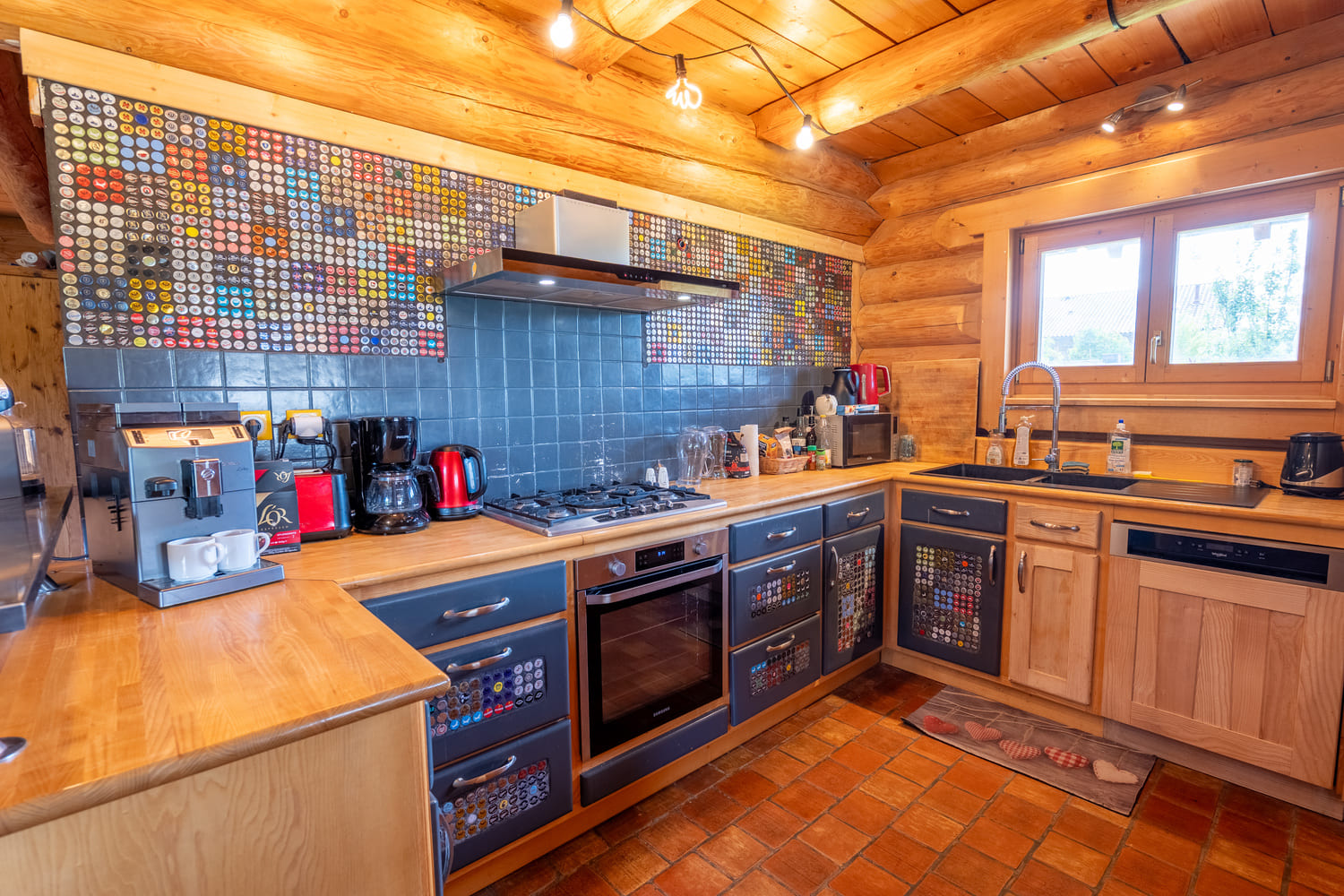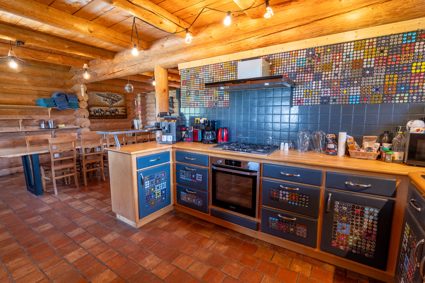 La cuisine, entièrement en bois massif, allie charme authentique et confort moderne. Avec son plan de travail spacieux, son four encastré, sa plaque de cuisson au gaz et ses électroménagers de qualité, elle est parfaite pour préparer des repas gourmands à partager en groupe. La crédence colorée apporte une touche de fantaisie et de modernité à cette pièce lumineuse et conviviale.