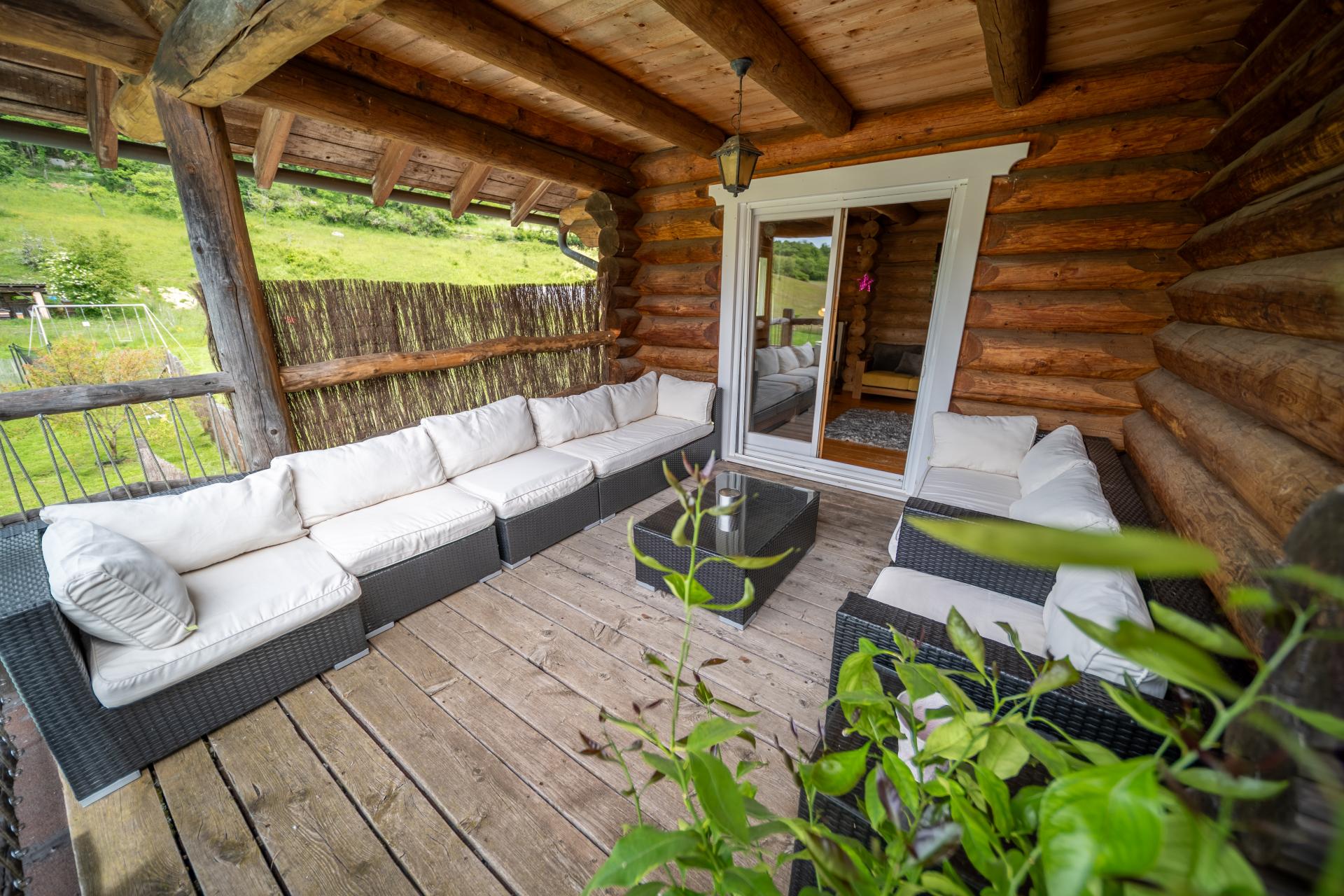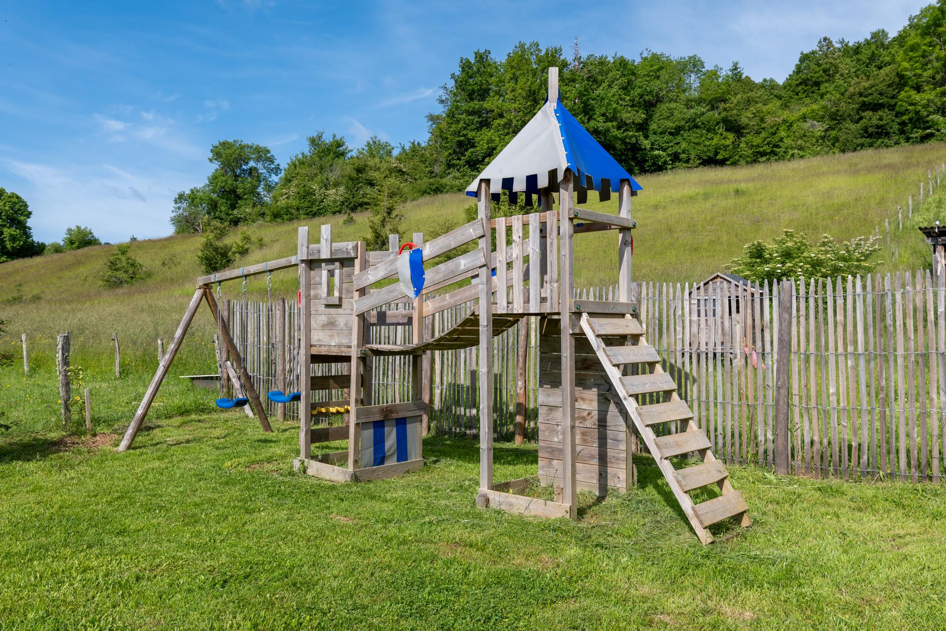 La grande terrasse en bois avec table en rondins est idéale pour les repas en plein air. Vous pourrez profiter de la piscine sécurisée, du bain nordique ou simplement vous détendre sur les transats. Le jardin privatif dispose d’un barbecue, d’un salon d’été et de jeux pour enfants (balançoire, trampoline, cage de foot). Un parking privatif peut accueillir jusqu’à six véhicules.