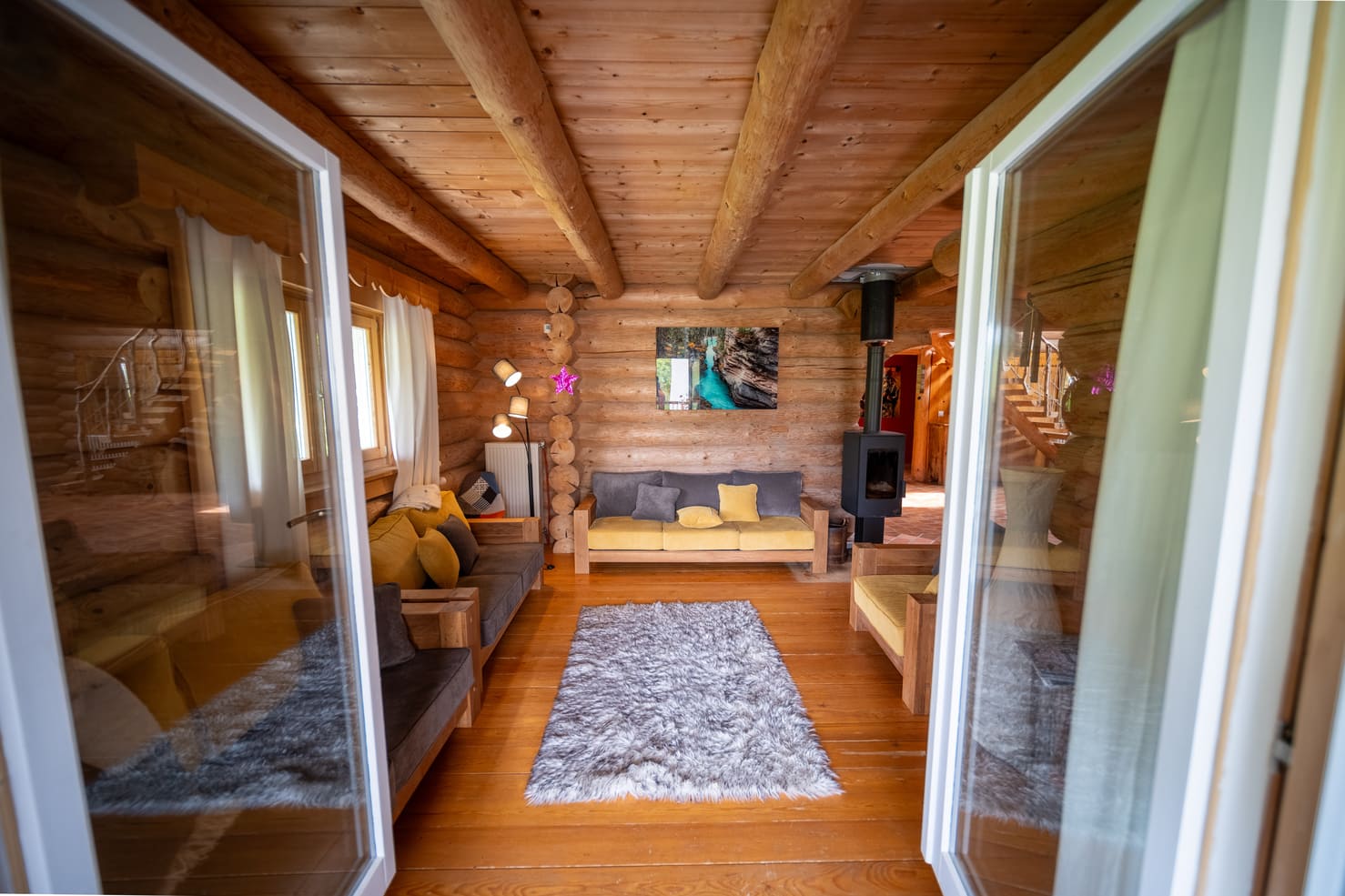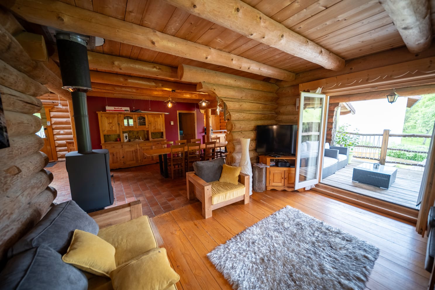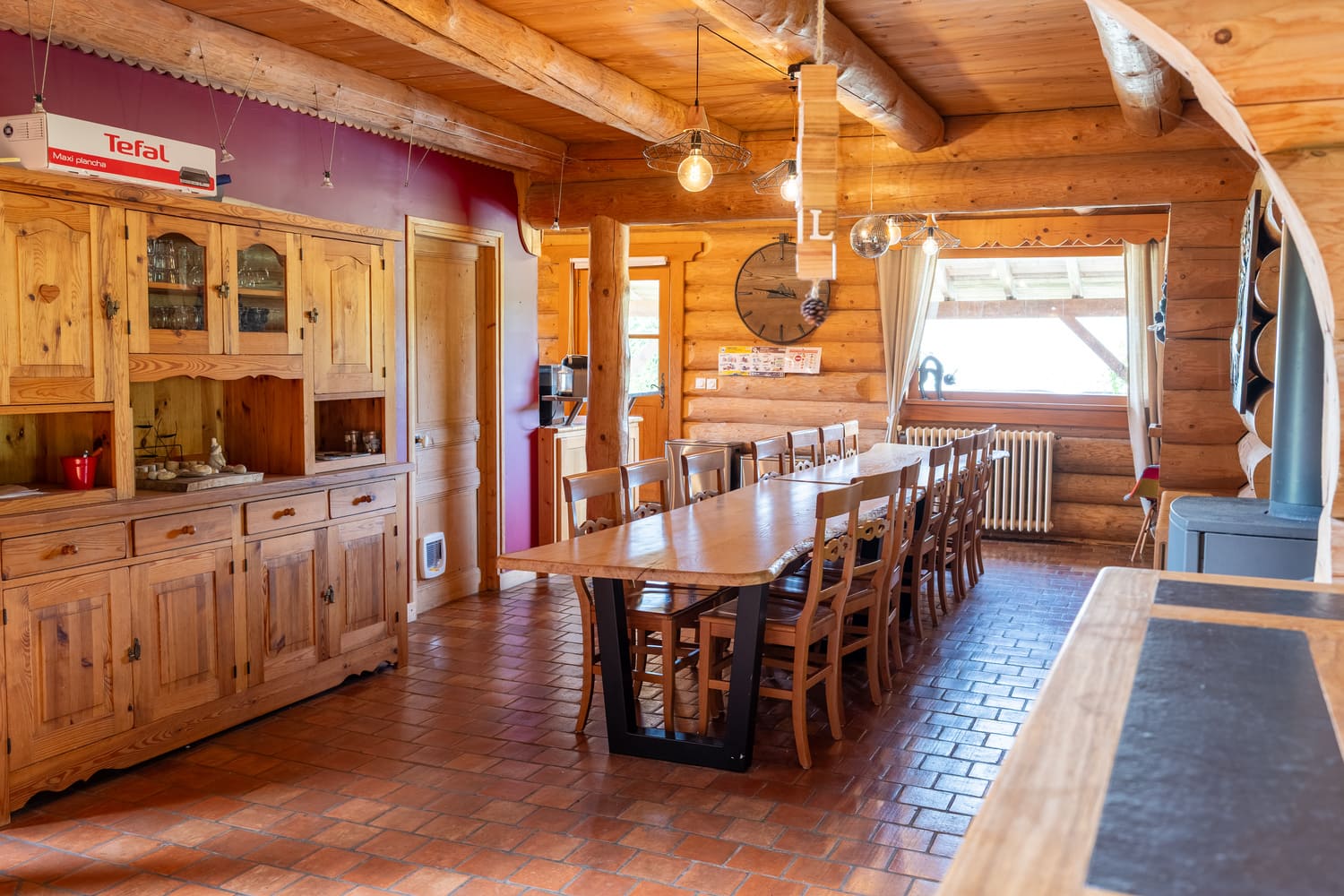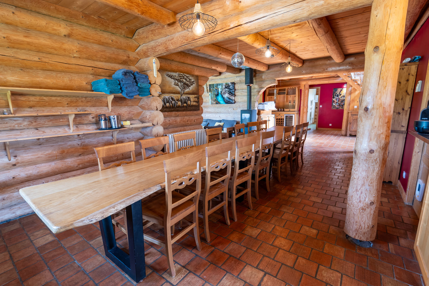 Au centre du chalet, la salle à manger dispose d’une grande table en bois massif pouvant accueillir tous vos convives. Elle s’ouvre sur un coin salon agrémenté d’un poêle à bois, pour des repas chaleureux et des soirées réconfortantes. Les murs en rondins et les finitions artisanales ajoutent une touche d’authenticité à cet espace.