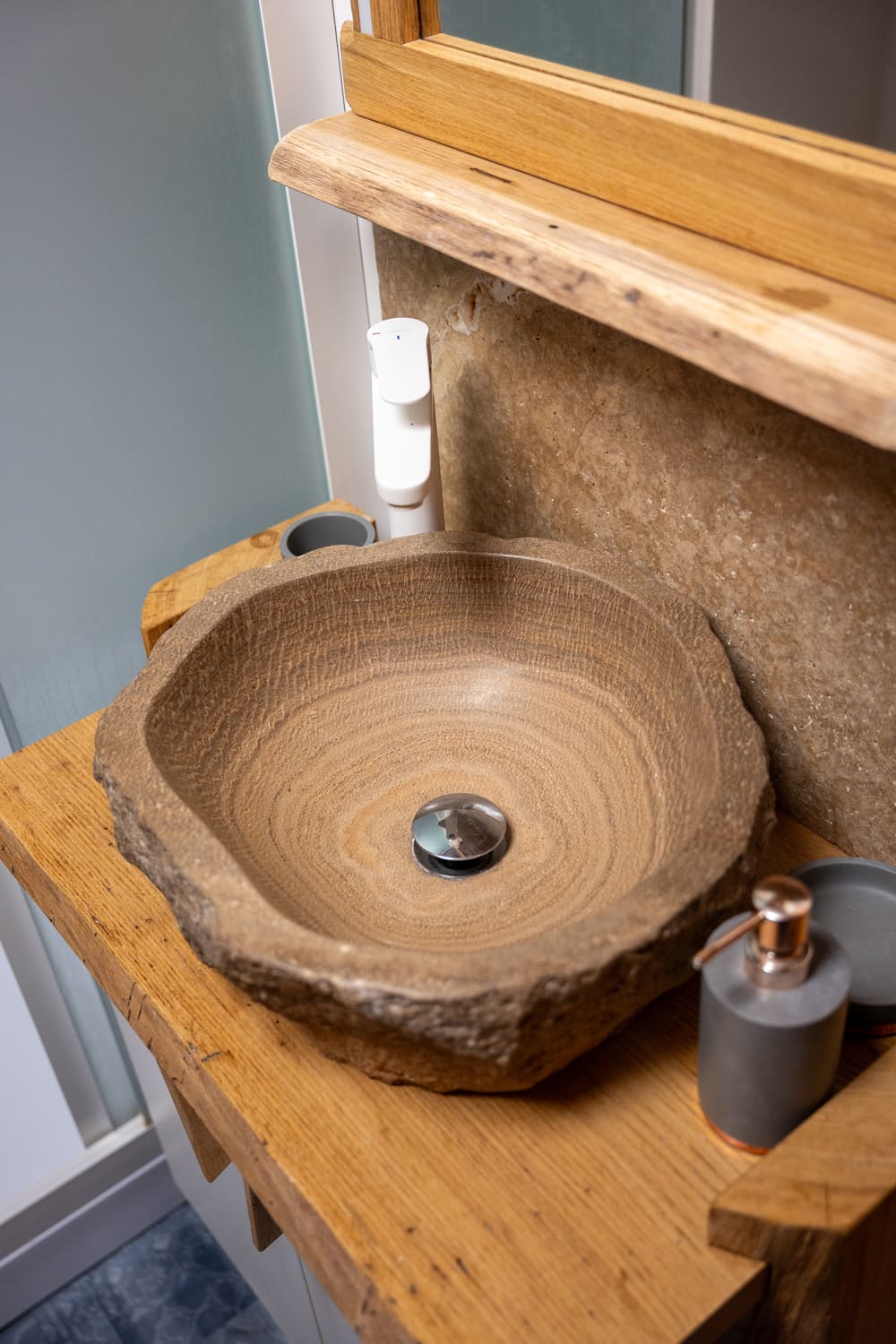 Le chalet dispose de trois salles d’eau modernes : deux au rez-de-chaussée et une à l’étage. La salle d’eau de la chambre principale forme une suite parentale avec douche à l’italienne, WC et sèche-serviettes. Les autres salles d’eau sont lumineuses, fonctionnelles et équipées de rangements pratiques, avec un WC indépendant supplémentaire.