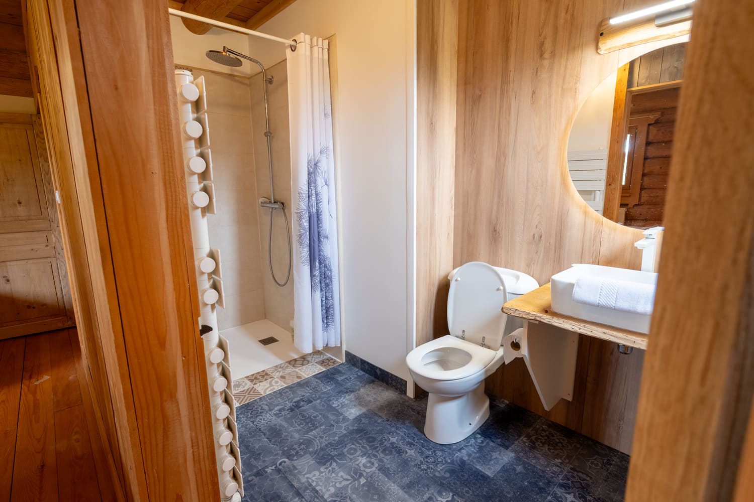 - Une chambre avec un lit double (160 × 200 cm) et sa salle d’eau privative avec douche à l’italienne, vasque, WC et sèche-serviettes, aménagée pour faciliter l’accès aux personnes à mobilité réduite
