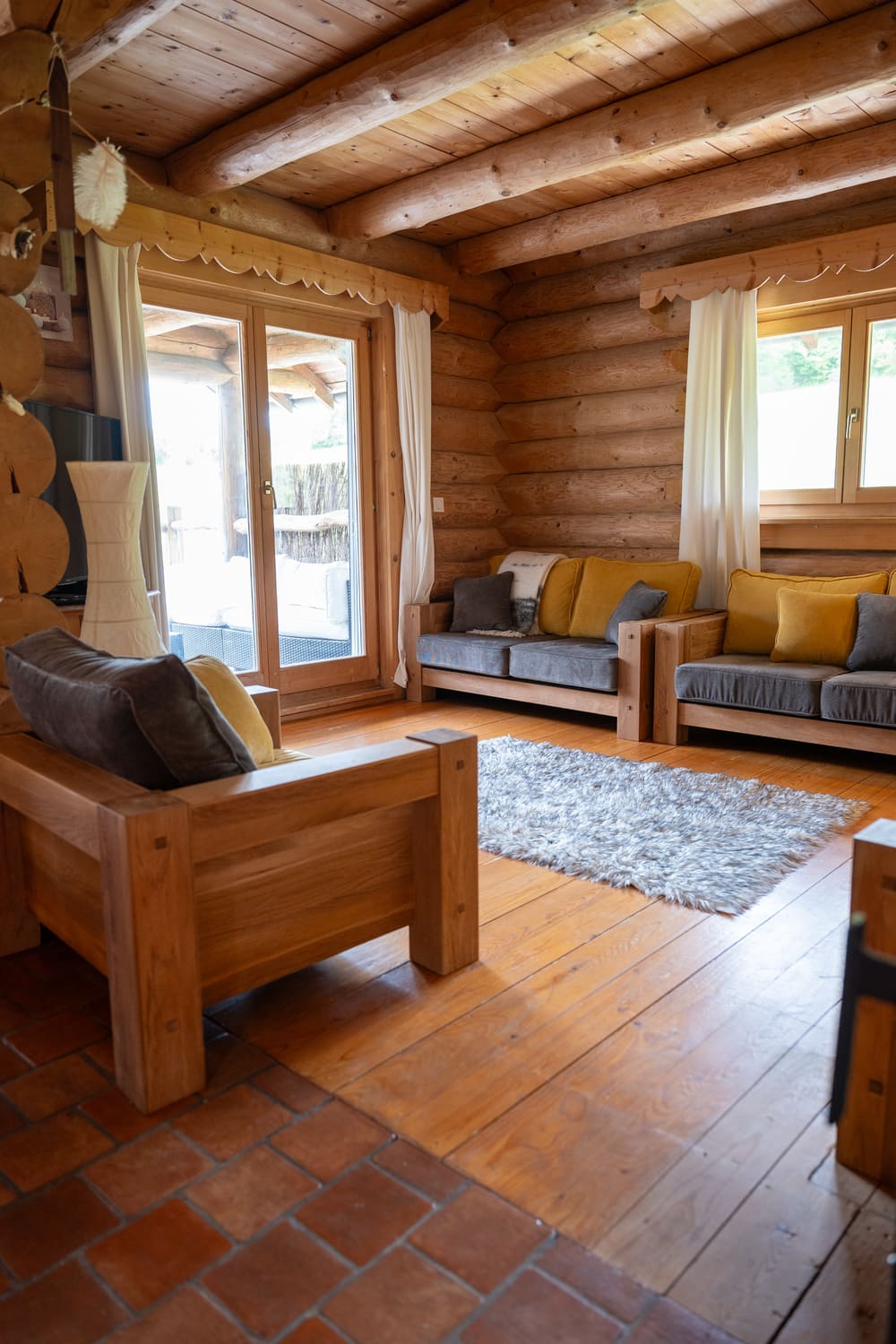 Entièrement habillé de bois, le salon invite à la détente. Les canapés confortables créent un véritable cocon pour se retrouver en famille ou entre amis. La grande baie vitrée et la porte-fenêtre offrent une vue sur la terrasse et la nature environnante, faisant de ce salon le cœur convivial de notre chalet pour groupe.